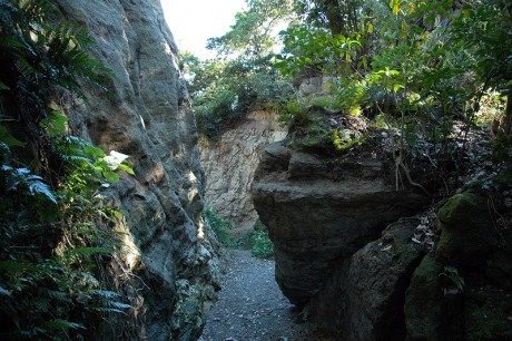 墓地の外れ、大切岸のわきにある細い道を上っていく。道のわきにはやぐら(鎌倉に特有の横穴式の墳墓)が見られる。
