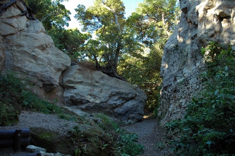 置石が点在するのはこの近辺で、筆者は置石の風景が気に入っているので、腰を落ち着けたくなるところだが、もう一度ここに戻ってくることになるので、先に亀ヶ岡団地方向へと切通しを歩くことにする。