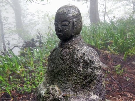 ここも地蔵めぐりのポイントで、登山道わきの石垣のうえには、蓮浄院地蔵が祀られている。