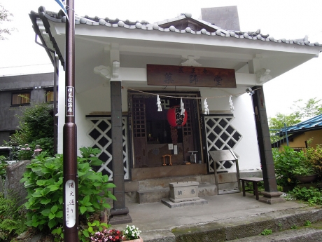 小間口を過ぎ、土産物店や湯の花まんじゅうの店などを眺めながら上っていくと、伊香保神社の石段と鳥居が見えてくる。神社に参詣する前に、石段の手前を右に曲がって湯元通りに入る。この道は湯元源泉地の日帰り入浴施設・露天風呂に通じている。時間があれば浸かりたいところだが、今回は諦める。通りを入ってすぐ右手に薬師堂が建っている。いまは小さなお堂だが、江戸時代には大いに栄えていたようだ。