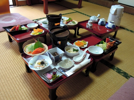 風景を眺めているうちに夕食の時間になった。夕食はお膳で部屋に運ばれてくる。われわれは食べるのは好きでも、量はそれほど食べないので、今回は、基本プランから料理の品数を減らした「お料理少なめ お得プラン」で予約をした。