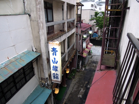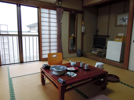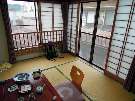 タクシーを降りるともう目指す宿が見えていた。丸本館は、木造4階建て、2階が宴会場、3階と4階に和室の客室が4部屋ずつある。われわれは3階の奥にある部屋に案内された。部屋は6畳、8畳、10畳があり、われわれが予約したのは8畳だ。ザックを下ろして、まずは一休み。