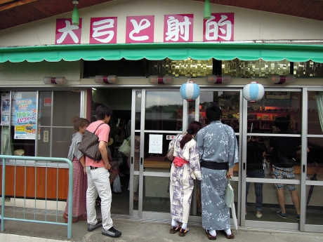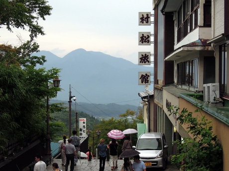 われわれは丸本館の前からまず石段を下ることに。浴衣姿の男女がちらほら目につく。石段からは、水沢山の山頂からも眺めた小野子山や中ノ岳(その左には十二ヶ岳が隠れている)がよく見える。射的で遊ぼうかとも思ったが、土産物店が早く閉まりそうなので、覗くだけにしておいた。