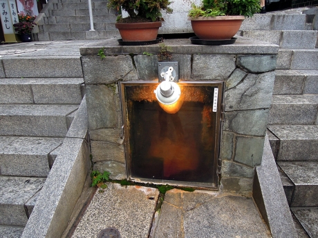 今度は石段を上へ。丸本館から少し上ったところに小間口があり、ガラスを通して流れていく温泉を見ることができる。この小間口の歴史は古い。『榛名と伊香保』(みやま文庫7、1962)に収められた佐々木一郎の論考「伊香保温泉の移り変わり」によれば、伊香保が伊香保神社の社領から七氏に分割され、温泉街の基礎が築かれたのが、武田氏が支配する天正の頃。その後、温泉街は十四軒の大家が支配する共同体となり、温泉に関する取り決めが交わされた。