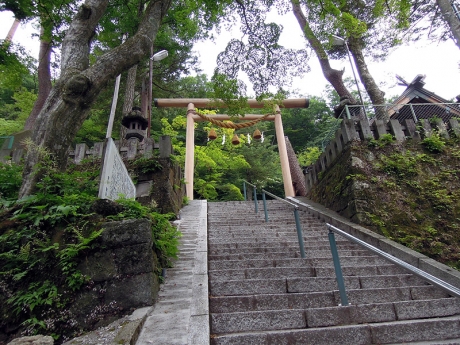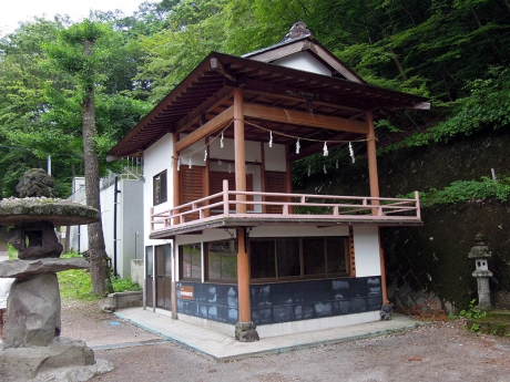 薬師堂にお参りし、道を戻り、伊香保神社の石段を上る。この神社については、次のその四であらためて書くつもりなので、ここではあまり触れない。社殿の向かいには神楽殿が建っている。その脇に伊香保森林公園に通じる道がある。その二でも少し触れたが、水沢山の山頂から伊香保方面に下った場合には、この道に下りてくることになる。