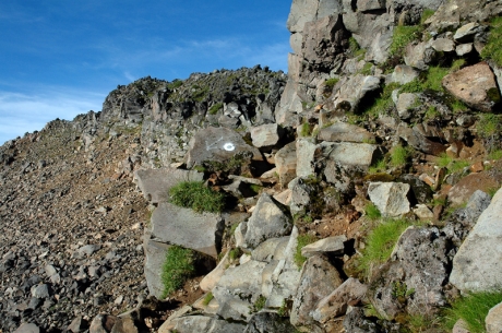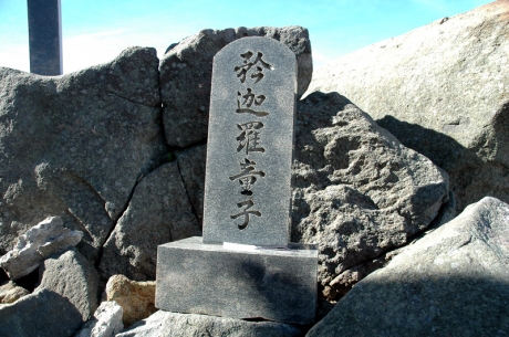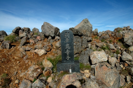 さすがに剣ヶ峰の頂上が近いだけあって、矜迦羅童子の碑の前から北の方向に目を向けると、御嶽山の山頂部がほとんど一望できる。昨日から今日にかけて歩いてきた場所だ。今朝、最初に立ち寄った二ノ池がずいぶん小さく見える。昨日はあまり天候に恵まれなかったが、今日は晴れてよかった。