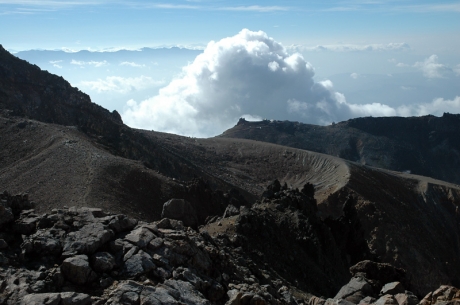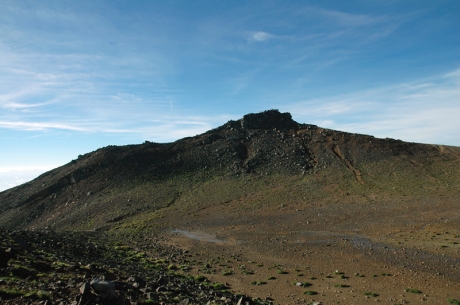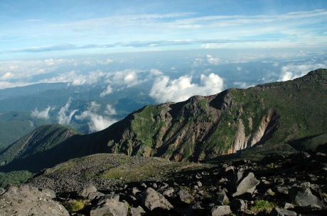 外輪の尾根に出たところから、一ノ池と剣ヶ峰を見渡す。これから外輪を半周するお鉢巡りをして山頂を目指す。