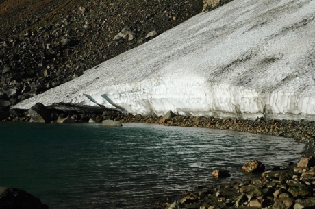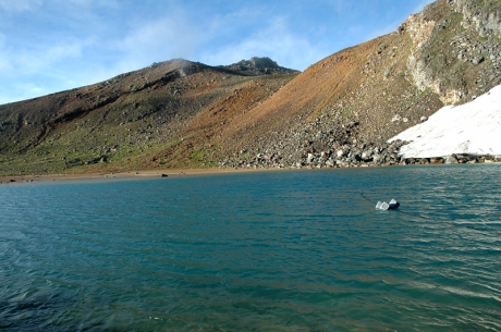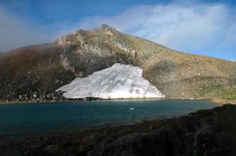 さらに、雪渓に関する記述も興味深い。「北西岸の斜面にある万年雪は、昼夜の気温差の影響を受けて融雪量が著しく変化する。この融雪量の変化が水面の水位を約四〇センチも上下させる。また、雪面に亀裂を生じさせて時折、湖面に雪が落下する。その時は湖面一帯に大きな津波が生じるほどだ」。おそらく雪渓は、このテキストが書かれたときよりも小さくなっているだろう。