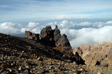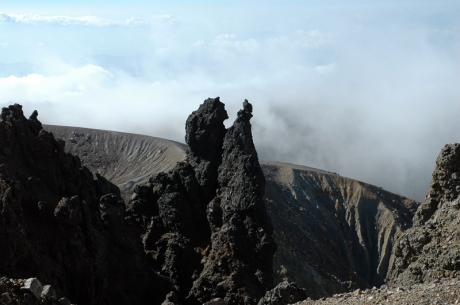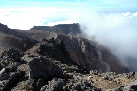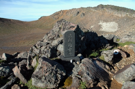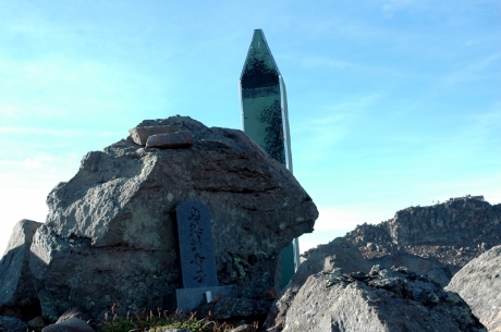 ■ (木曽御嶽山に登る その三のつづき)本日は、まず二の池新館から一の池の外輪をめぐって御嶽山の最高地点である剣ヶ峰の頂上(3067m)を目指す。その山頂から王滝頂上神社が鎮座する王滝頂上を経て、黒沢口登山道を下る。登山道の9合目には、開山の祖である覚明行者を祀った覚明堂がある。