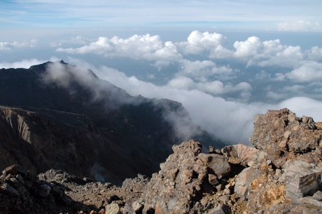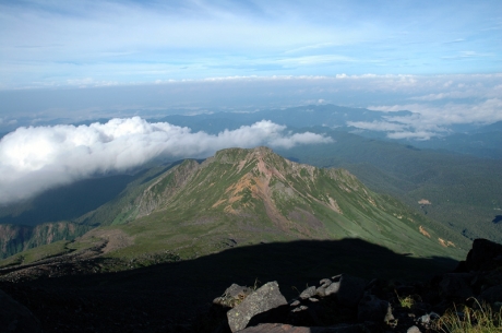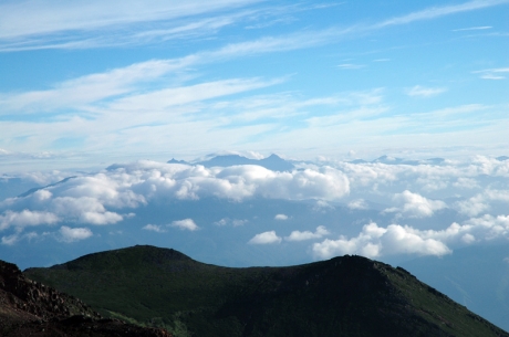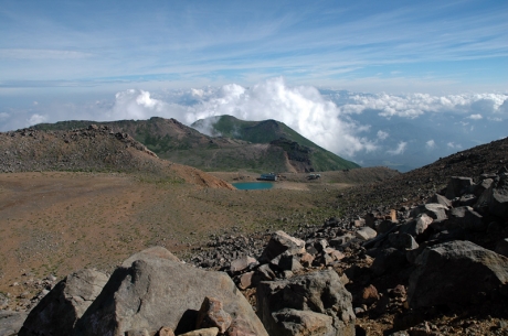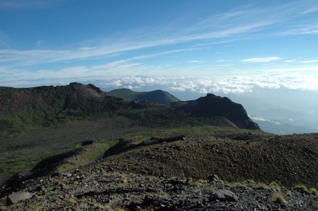 さらに北方向の遠望も素晴らしい。広い火口原に二の池新館が小さく見える。その向こうに摩利支天とアルマヤ天、ふたつの山の稜線から継子岳の二峰が頭を出し、その向こうには雲海と青空が広がっている。