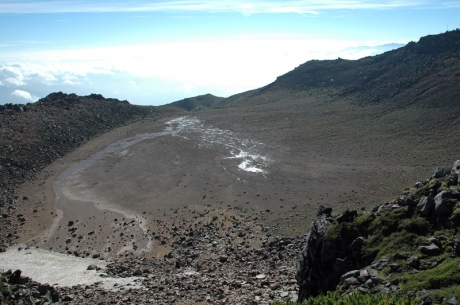一ノ池の広々とした火口原を見渡す。外輪の斜面の雪渓から水が流れた跡が見える。