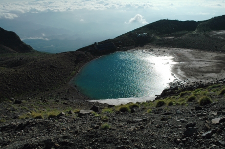 二ノ池から今度は一ノ池の外輪の尾根に出るために斜面を登っていく。その斜面から見下ろした二ノ池も美しかった。湖の向こうに雲海と麓の景色が見えるため、高所にある湖を実感できる。