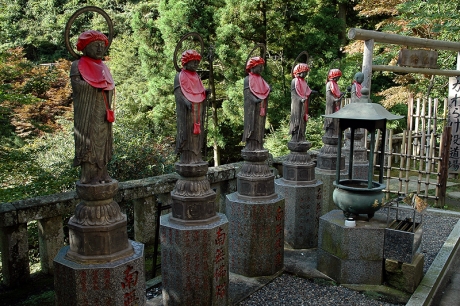 石段の両脇には本尊不動明王の眷属である童子像が並んでいる。先月登った木曽御嶽山には不動明王の眷属の名前が刻まれた三十六童子の石碑をたどるお鉢巡りがあったが(展望に恵まれたお鉢巡りと地獄谷――木曽御嶽山に登る その四参照)、こちらの童子の配置にもそんな意味が込められているのかもしれない。